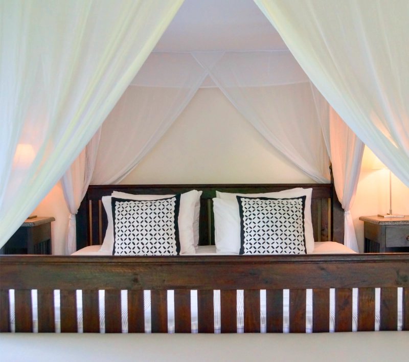 Alle slaapkamers hebben stoere hemelbedden. In twee kamers staan grote tweepersoons bedden. En in één kamer vindt u twee eenpersoons bedden. Ze hebben stuk voor stuk een en-suite badkamer met douches en dubbele wastafels. Elke kamer heeft individuele airconditioning, een fan aan het plafond en ruime ingebouwde kasten. Ook aan grote en kleine handdoeken, badlakens voor bij het zwembad, zelfs aan strandhanddoeken is gedacht. Koele batik kamerjassen, een kluisje en haarföhns behoren tot de standaarduitrusting.