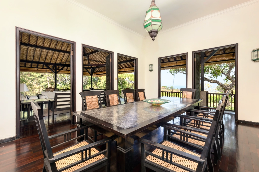 In de aparte eetkamer staat een prachtige terrazzo eettafel. Met daaromheen tien grote stoelen naar een voorbeeld uit de tempo doeloe tijd. In deze ruimte wordt uw ontbijt opgediend (inbegrepen in de huurprijs). En we kunnen hier ook een verrukkelijk Balinees diner serveren. Naast de woonkamer bevindt zich een pantry met onder andere een koelkast/vriezer, kookplaat, waterkoker en broodrooster. En er is ook een Nespresso apparaat.