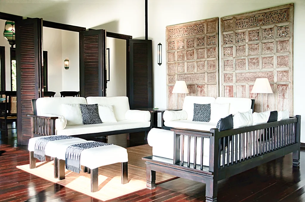 De gelijkvloerse vakantievilla heeft een woonoppervlakte van maar liefst 300 m². De vloeren zijn van lokaal ulin (ijzerhout). En rondom de hele houten veranda hangen bamboe zonneschermen. In de verhoogde open woonkamer heeft u zicht op het indrukwekkende alang-alang dak boven uw hoofd. Er staan drie brede zit- en loungebanken, antieke leunstoelen, terrazzo tafels, originele Batavia stoelen en (als kunst) antieke Javaanse poortdeuren. Die aankleding geeft het luxe vakantiehuis een unieke en authentieke tropische sfeer. Met als bonus adembenemende uitzichten op Lovina Beach, vissersboten, rijstvelden en de prachtige tropische tuin. En niet te vergeten: magnifieke zonsondergangen in het Westen!